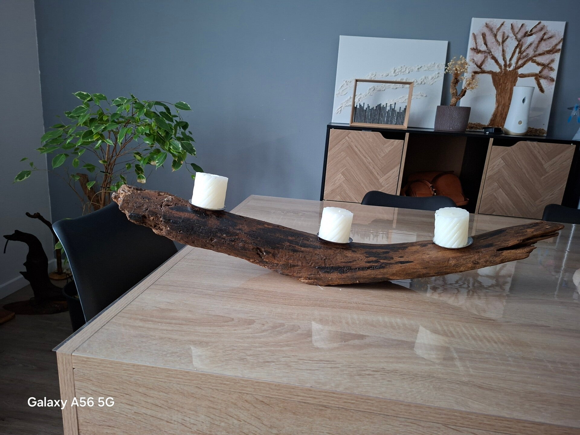 Centre de table en bois recyclé avec support bougie incluse. Ce centre de table est fabriqué artisanalement à partir de bois de recyclage ramassé dans la nature, et soigneusement transformé . Cet article peut provenir d'arbre donc ne peut être reproduit à l'identique car ils possèdent une forme unique. Frais de port inclus.